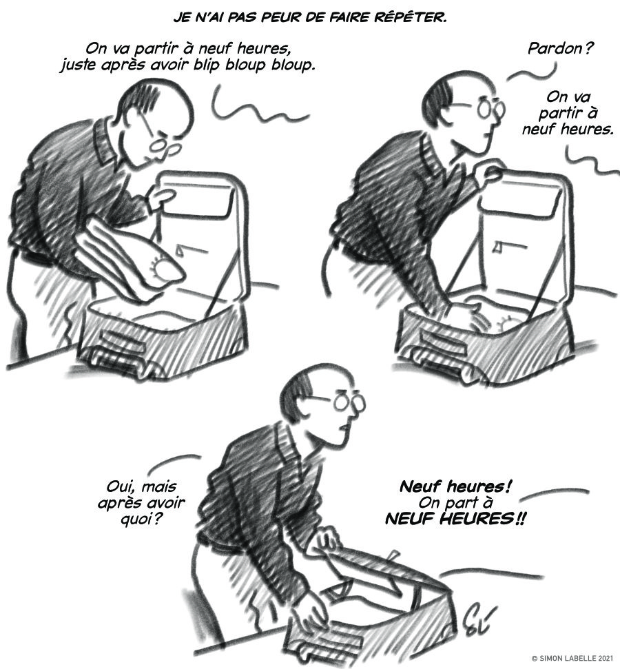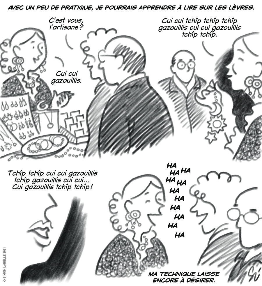 Aussi, les moments humoristiques sont efficaces, non seulement en raison de l’angle d’approche choisi, mais parce que c’est très personnel et intime. L’auteur présente sa réalité en restant franc et authentique, et ne prétend pas se faire le porte-parole de toute une communauté. Il ne cherche pas non plus à s’apitoyer sur son sort, et les nombreux moments cocasses tirés d’événements ordinaires parviennent à faire apparaître de nombreux sourires en coin au moment de leur lecture. Malgré tout, Labelle soulève des enjeux qui sont sérieux, nous entraînant dans une certaine remise en question de notre propre approche à la surdité et notre manière d’y réagir lorsque nous y sommes confronté.es. Il met en scène des situations et réactions qui peuvent s’avérer être dérangeantes ou inappropriées sans toutefois tomber dans un ton accusateur. En fait, il en résulte plutôt un humour grinçant bien dosé et qui tisse une trame narrative unique qui est propre à l’auteur. La surdité est un univers relativement méconnu, et Labelle y rend l’accès, tout comme à son intériorité, plaisant, léger, mais utile, touchant et pertinent surtout.