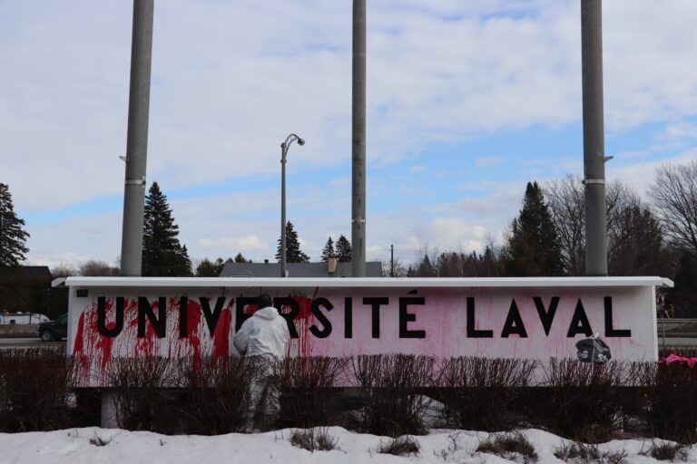 Dans la nuit de lundi à mardi, l’enseigne de l’Université Laval visible sur le boulevard Laurier a été aspergée de peinture rouge. Une arrestation a eu lieu suite à l’évènement. L’action pourrait avoir un lien avec un geste similaire commis le même soir qui dénonce les rapports entre l’Université de Montréal et l’État israélien. Une association locale qui milite pour la cause palestinienne sur le campus stipule qu’elle n’a aucun rapport avec l’action.
