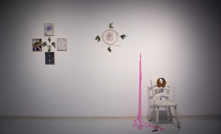 Pendant toute la visite, une œuvre marquée par la violence de son évocation: sur un coussin brodé encerclé de dentelle fine se tient un collet en métal, un chapelet en perles rouges et bleues d’où une croix dorée se pend en guise d’appât. Gins of the Church (2022) dénonce tout le rôle de la religion, renforcé par la couronne, dans la perte identitaire des Premières Nations.