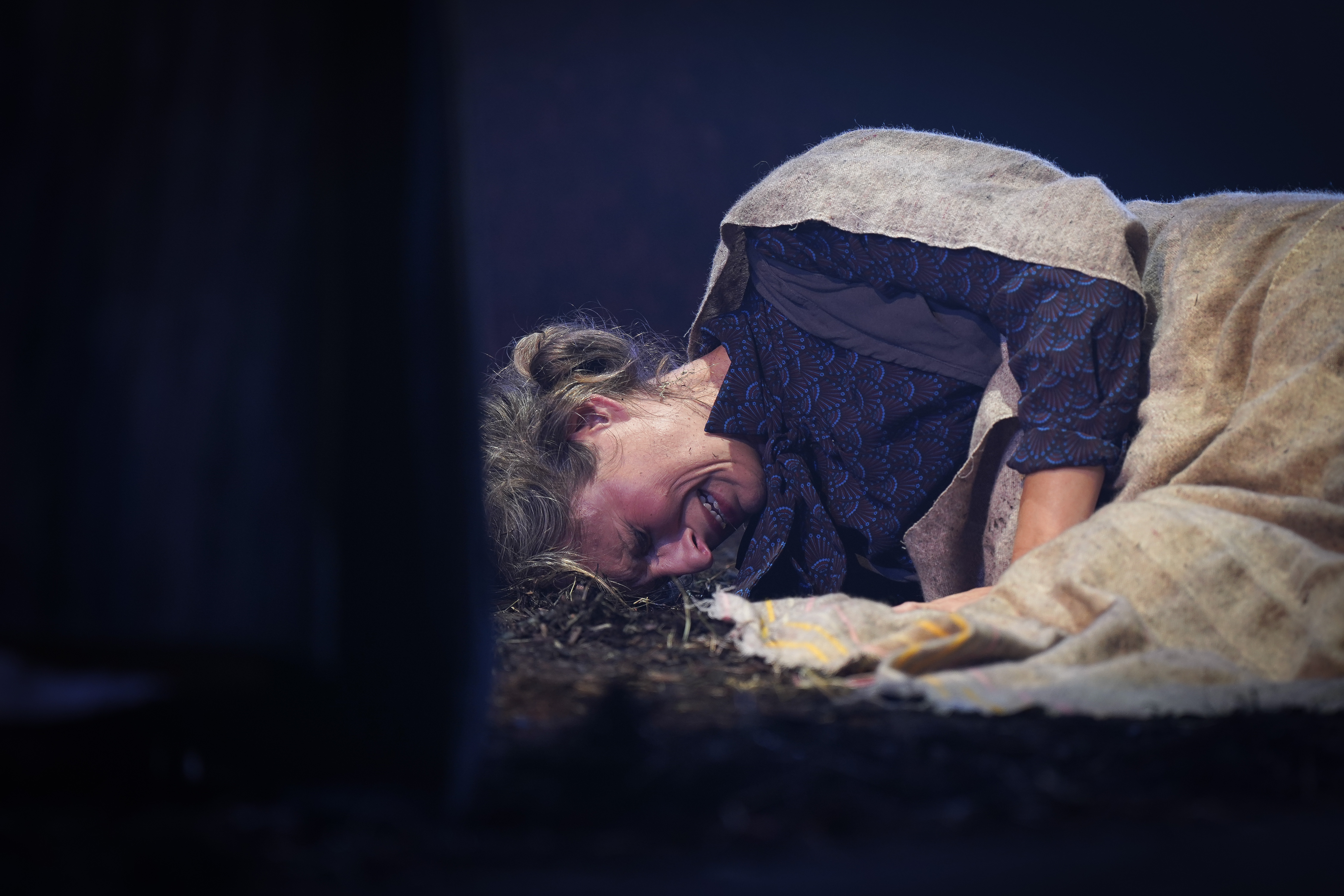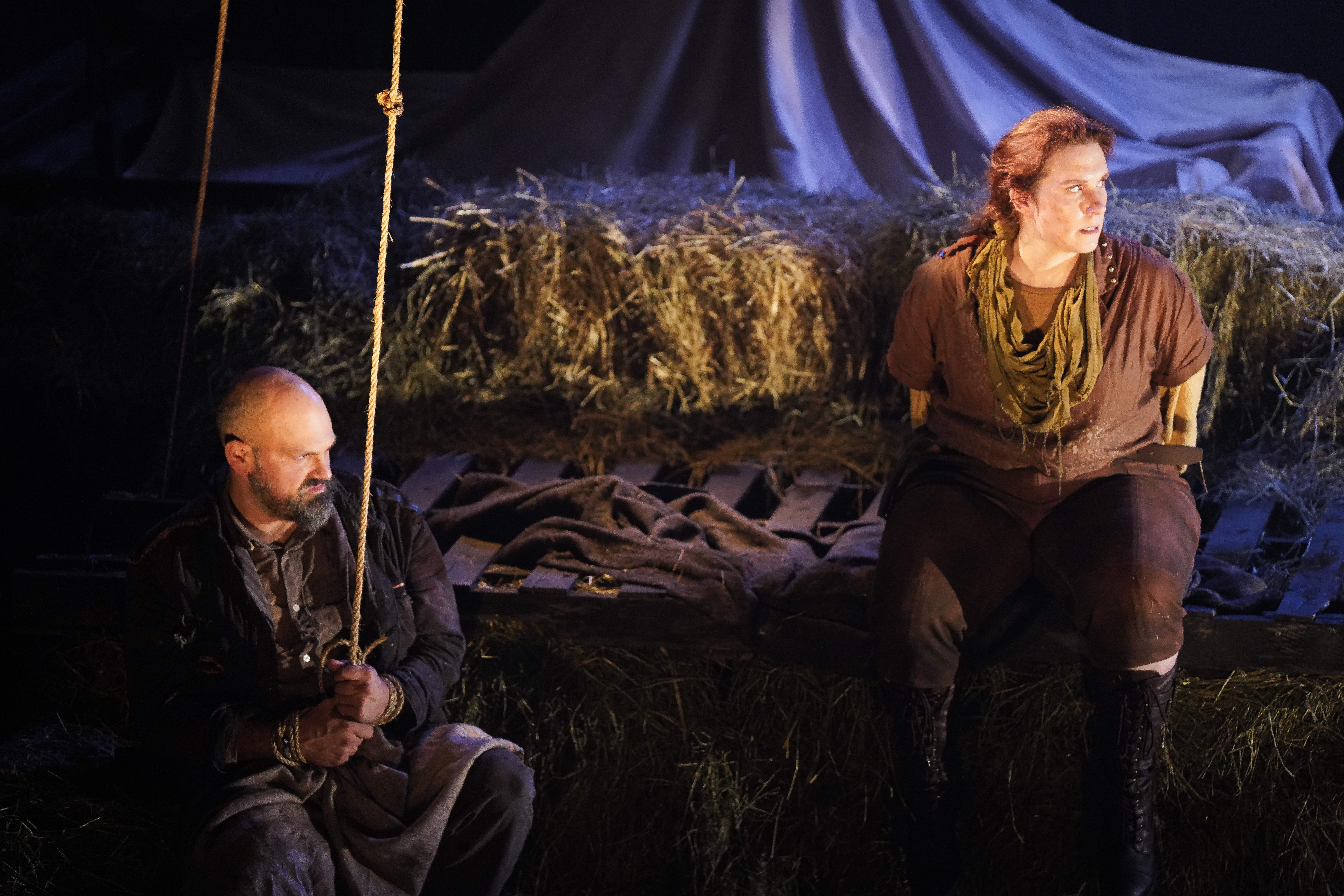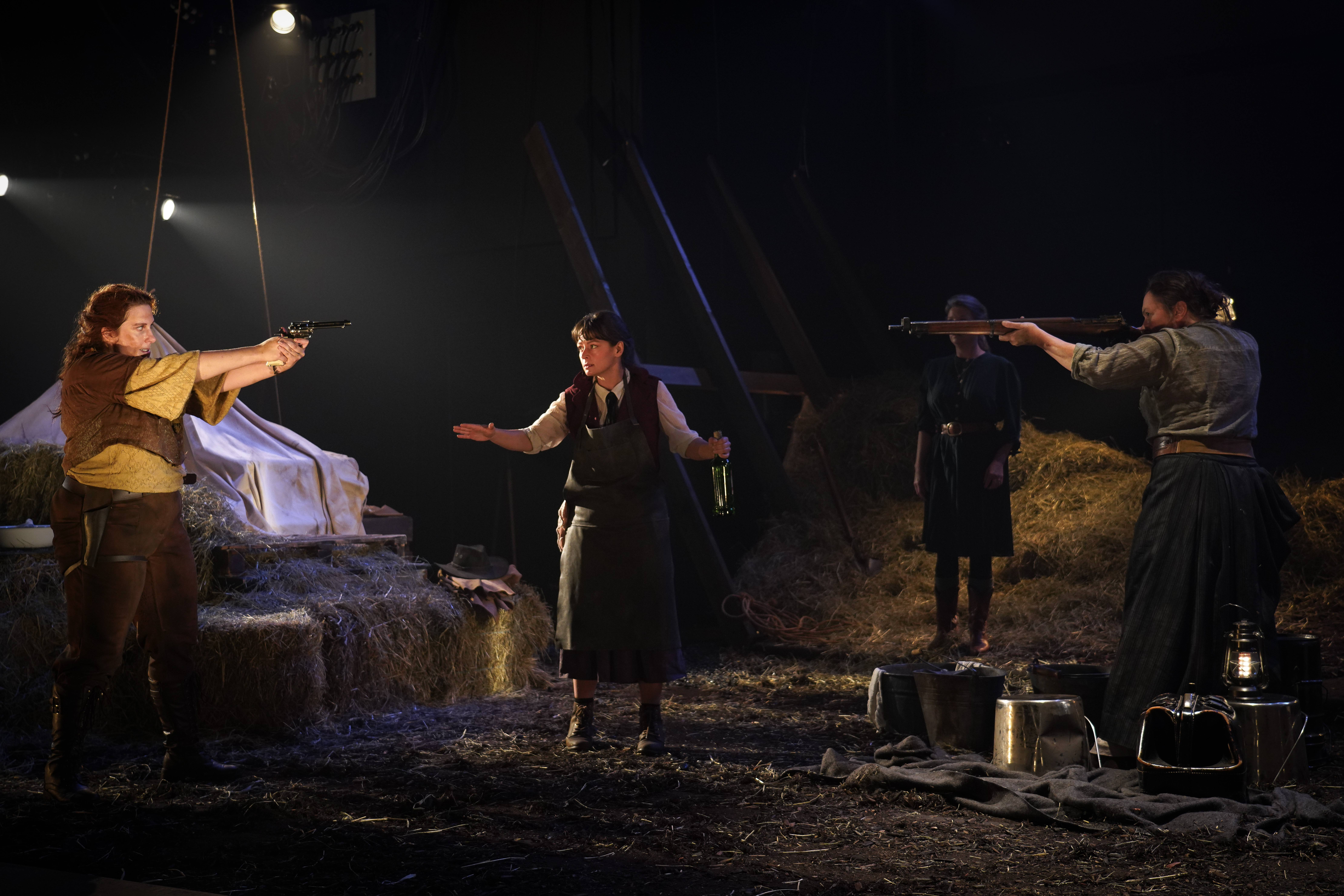Si on tente à la fois de reprendre certains codes du western – que dire, en ce sens, du « générique » au tout début nous montrant tour à tour les six femmes, bien campées et intenses ! – et de varier la formule en proposant, par exemple, des moments réflexifs et introspectifs hors scène, hors du temps, d’autres éléments semblent, quant à eux, superflus ou non nécessaires. Pensons notamment aux néons suspendus, détonnant d’une part par leur couleur froide et leur modernité surplombant la grange tamisée, et d’autre part, par leur arrivée soudaine que très tardivement dans la pièce. Autre détail : on nous avait prévenu.es, avant toute chose, de la présence de coups de feu. Néanmoins, il semble que l’avertissement ait créé des attentes qui, malheureusement, n’ont pas nécessairement été atteintes : les détonations auraient peut-être mérité d’être plus franches et marquées, semblant parfois se fondre avec un bruit de tonnerre nettement moins frappant. Même chose du côté des face-à-face et de la violence. De manière générale, les scènes ne manquent pas. La tension est palpable, on s’inscrit dans une monstration totale et on ne fait pas dans la retenue. À d’autres moments, pourtant, on cherche à la voiler, mais pas totalement. Pour s’assurer de réussir le pari, dans ce contexte, autant y aller à fond pour tout, ou pour rien, sans censure et sans demi-mesure.