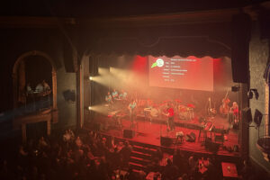 Le principe de la soirée ? Des combats musicaux inspirés de la tradition de l’impro théâtrale. Avant chaque pièce, l’arbitre annonce le thème/règles de la manche et accorde un temps de caucus. Hier soir, l’improvisation la plus populaire à été celle où les équipes ont dû choisir un pays et une décennie, puis continuer la musique correspondante choisis au hasard. À eux d’improviser une narration sonore cohérente et surprenante, parfois l’accompagnant de chant, alors que les projecteurs participent à l’énergie des morceaux, guidés par les applaudissements d’un public qui n’a pas froid aux mains.