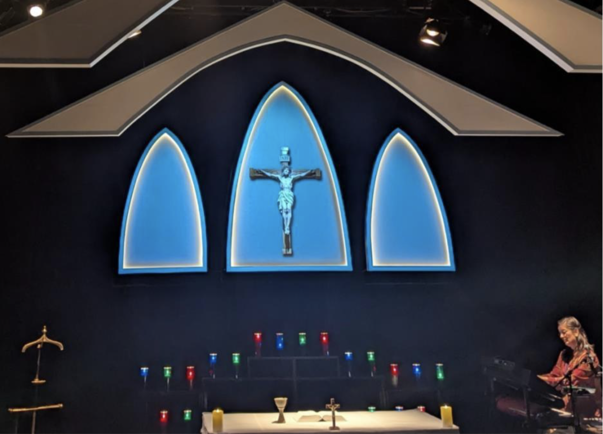 Le décor est minimaliste, mais d’une richesse symbolique. Les vitraux d’église se transforment en hublots d’avion, en paysages du Québec, de Paris, de New York. L’autel devient bar, ville, chambre. Le jeu de lumière crée des ambiances mouvantes, en parfaite harmonie avec les émotions du personnage. La musique, jouée en direct par Marjorie Fiset, complimente les scènes avec finesse.